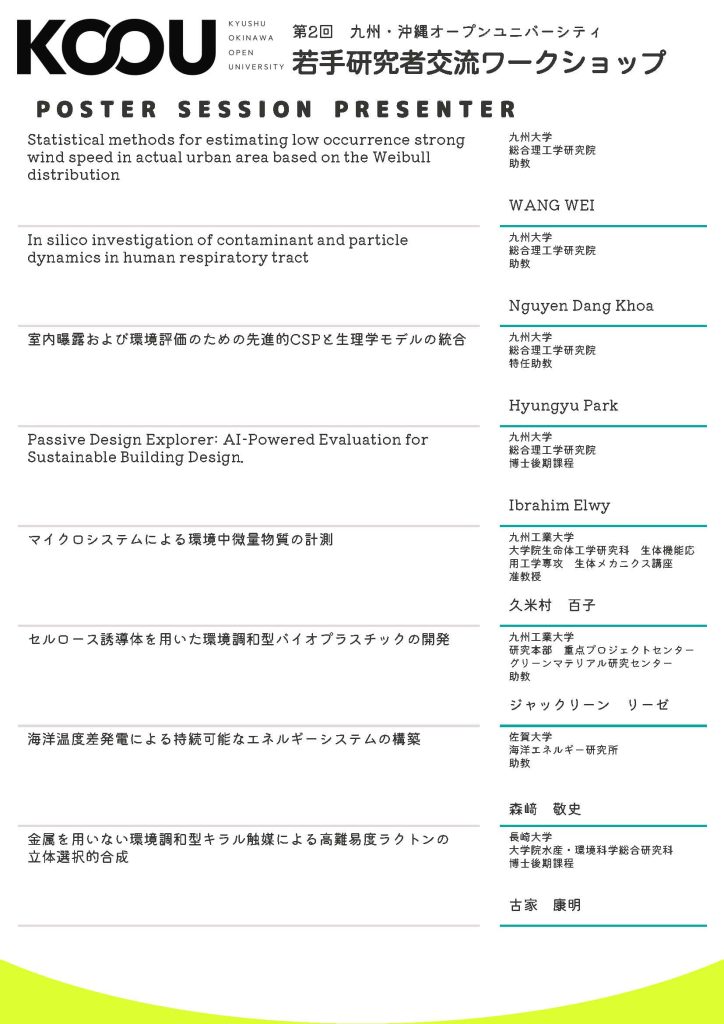 今回は、「九州から世界へ-九州地域発の環境研究の可能性-」をテーマに、九州・沖縄地区の国立大学の若手研究者が研究発表を行うワークショップを開催するとともに、ポスターセッション、その後の懇親会を予定しています。